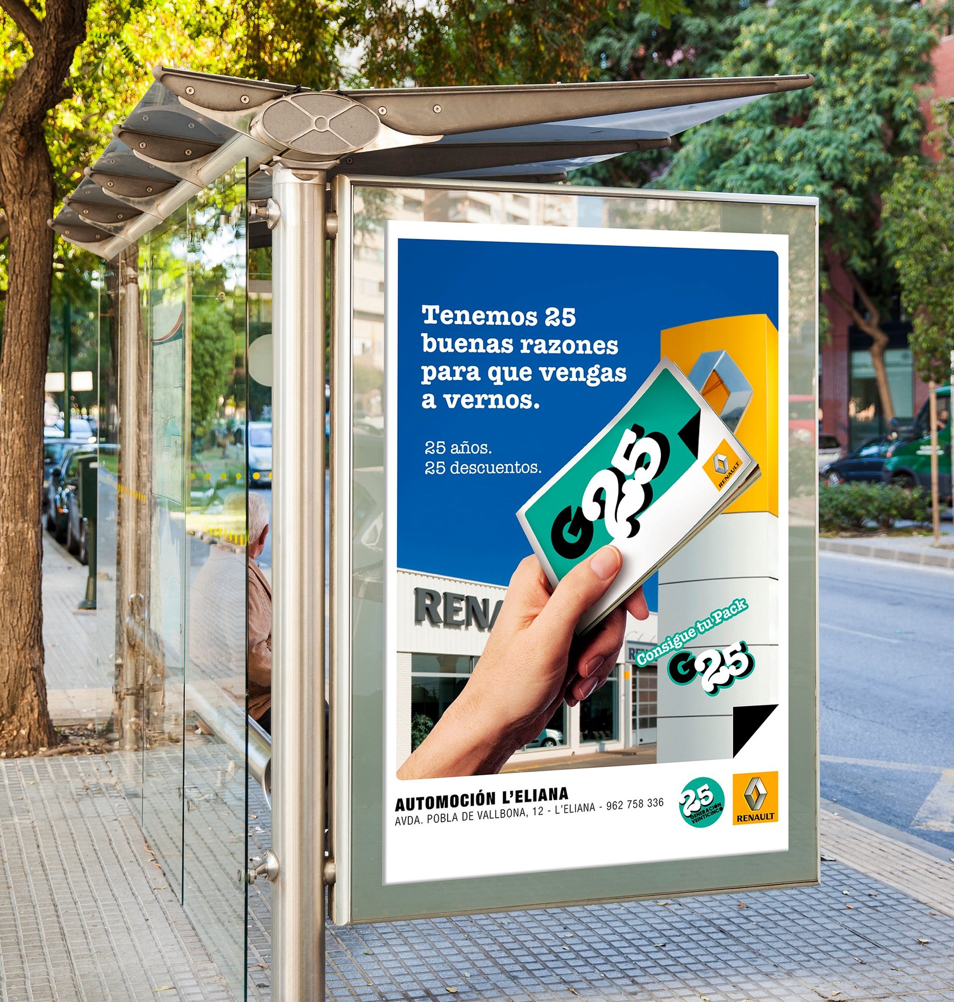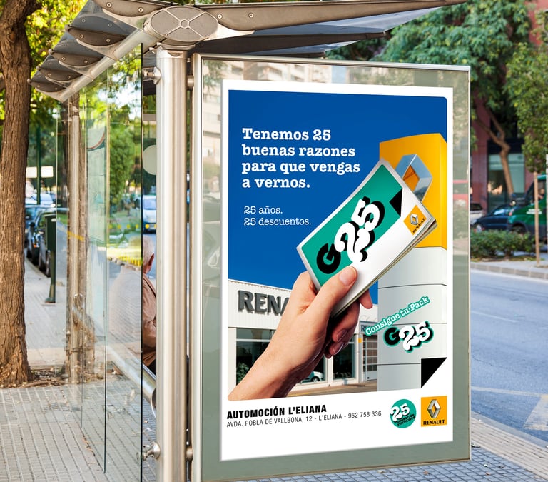 Diseño de campaña publicitaria "Generación 25" para Red Renault de la Comunidad Valenciana. Diseño de valla, cartel, pack y folleto.