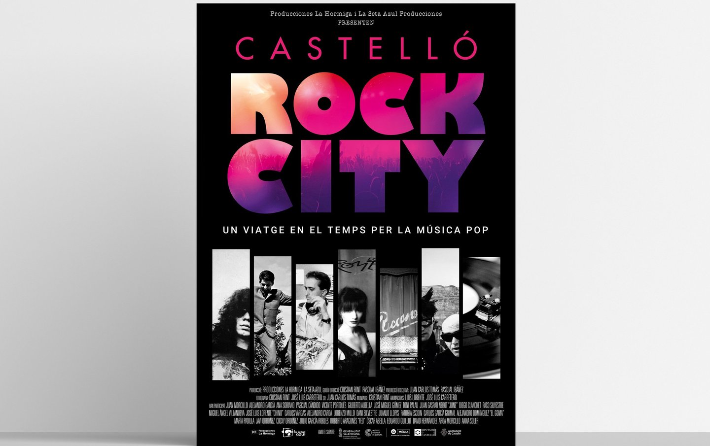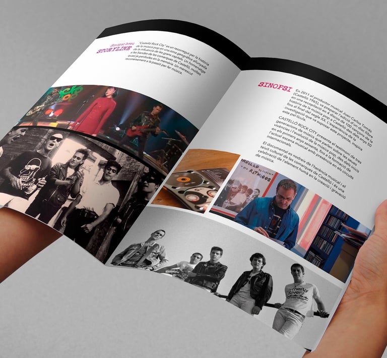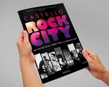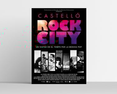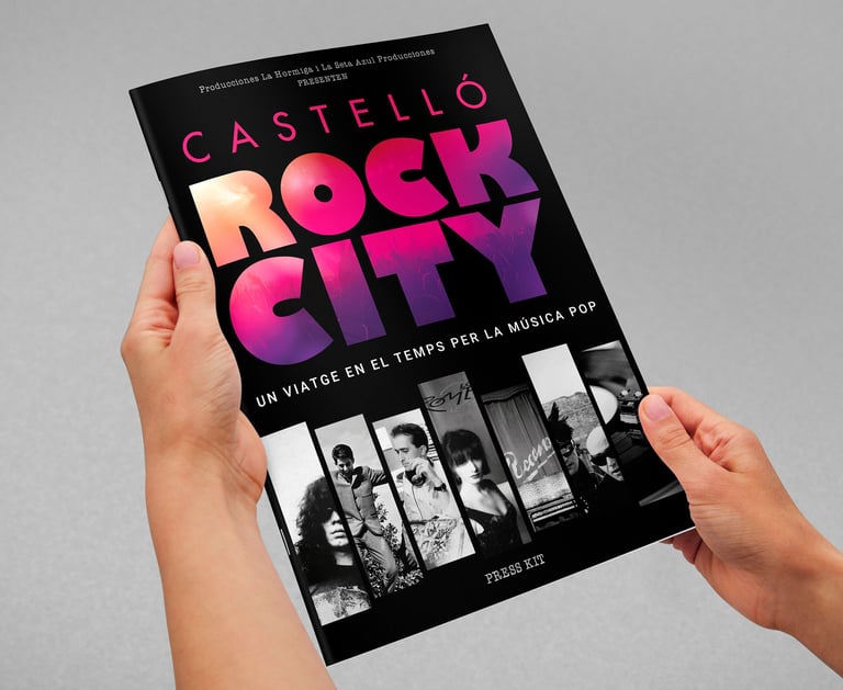 Diseño de marca, cartel y press kit para la promoción del lanzamiento del documental "Castelló Rock City. Un viatge en el temps per la música pop".