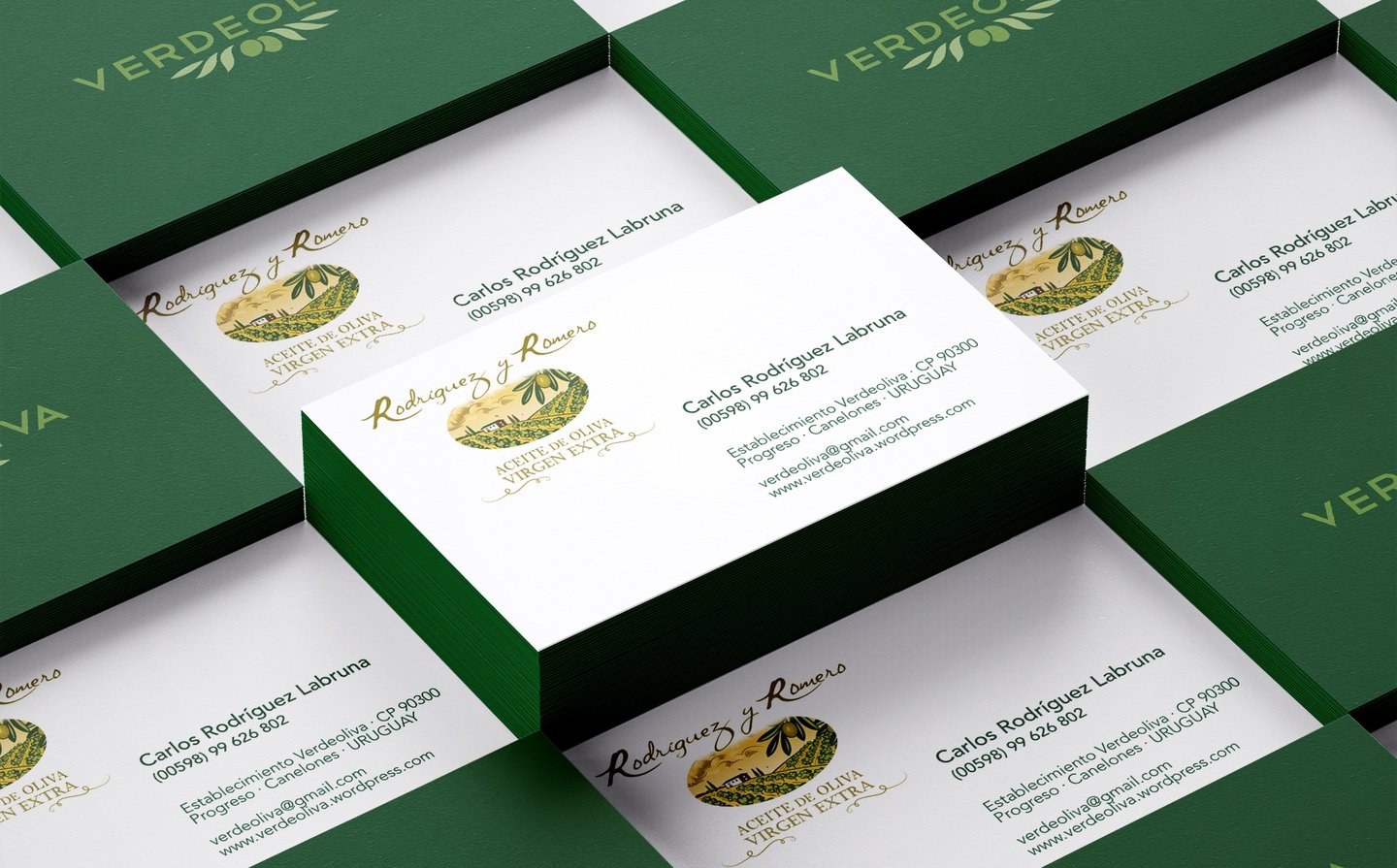 Diseño de marca y aplicaciones para Verdeoliva, productor del aceite de oliva virgen "Rodríguez y Romero", así como branding y packaging para la marca del propio aceite.